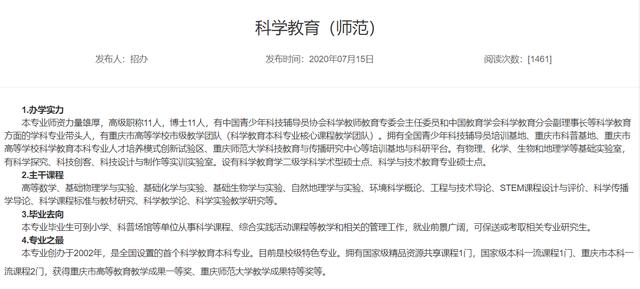 5.不同学校侧重点会不一样,有些学校把这个专业设置在物理系,物理课程会多一点,有些学校放在生物或者化学系,生化课程会多一点。其实这个专业比较重要的是熟悉初中或者小学的课程内容,教法学法,初中的科学教育用不到很高深的专业内容,但是各方面的知识都要有,要清楚各学科的学习方法。