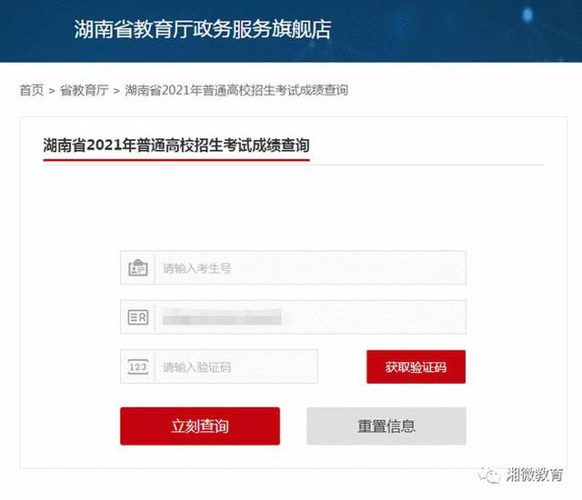 进入湖南教育政务网(http://jyt.hunan.gov.cn/),点击首页“湖南省2021年普通高校招生考试成绩查询”大图,进行认证登录后,输入相关信息即可进行查询。