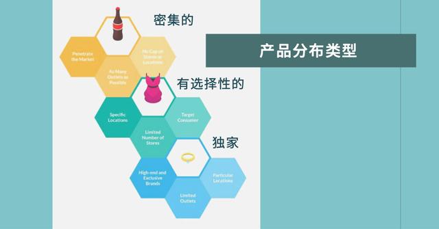 独家分销(仅在少数几个网点销售)、选择性分销(仅在相关网点或环境中销售)和密集分销(几乎在任何地方销售)。