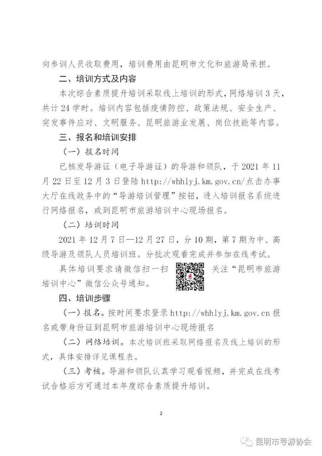 具体培训要求请微信扫一扫关注“昆明市旅游培训中心”微信公众号通知。