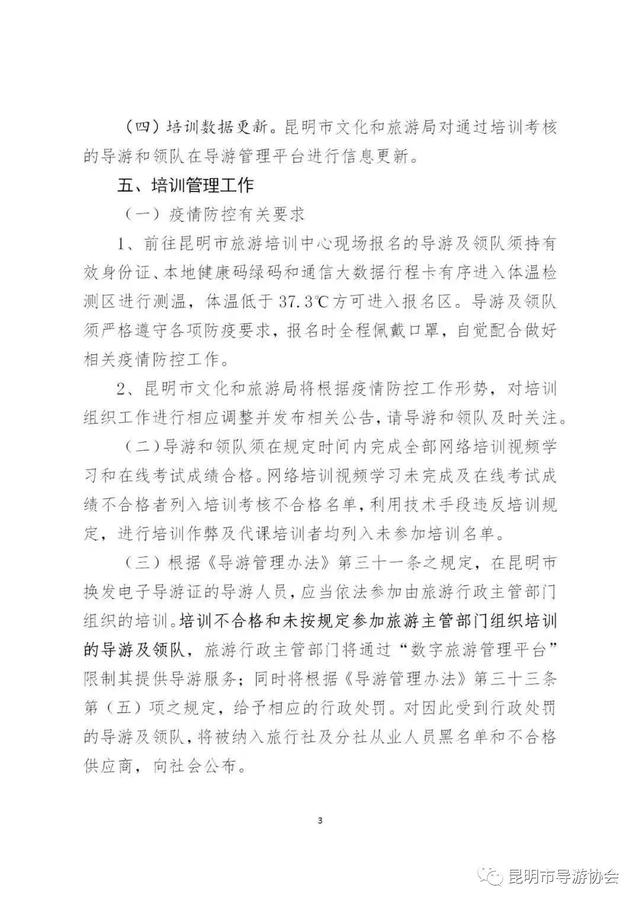 (三)根据《导游管理办法》第三十一条之规定,在昆明市换发电子导游证的导游人员,应当依法参加由旅游行政主管部门组织的培训。培训不合格和未按规定参加旅游主管部门组织培训的导游及领队,旅游行政主管部门将通过“数字旅游管理平台”限制其提供导游服务;同时将根据《导游管理办法》第三十三条第(五)项之规定,给予相应的行政处罚。对因此受到行政处罚的导游及领队,将被纳入旅行社及分社从业人员黑名单和不合格供应商,向社会公布。