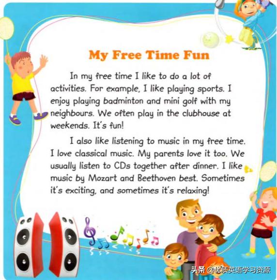 In my free time I like to do a lot of activities. For example, I like playing sports. I enjoy playing badminton and mini golf with my neighbours. We often play in the clubhouse at weekends. s fun! I also like listening to music in my free time I love classical music. My parents love it too. We usually listen to CDs together after dinner. I like music by Mozart and Beethoven best Sometimes it's exciting, and sometimes to relaxing!