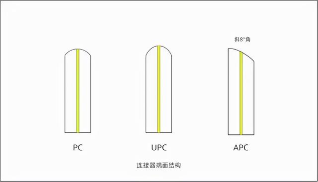 APC (Angled Physical Contact) 称为斜面物理接触,光纤端面通常研磨成8°斜面。8°角斜面让光纤端面更紧密,并且将光通过其斜面角度反射到包层而不是直接返回到光源处, 提供了更好的连接性能。
