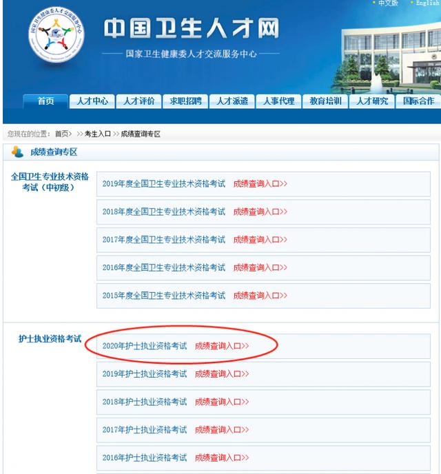 1、登录“中国卫生人才网”网站,点击进入“2020年护士执业资格考试成绩查询入口”。
