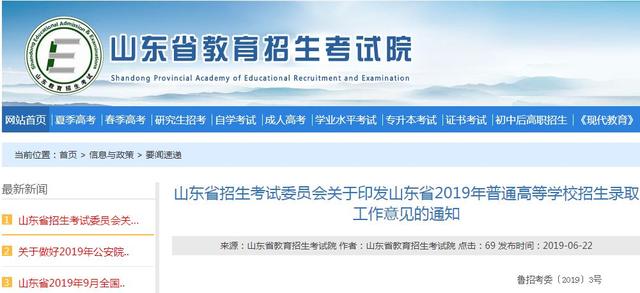 《山东省招生考试委员会关于印发山东省2019年普通高等学校招生录取工作意见的通知》(以下简称《通知》)。
