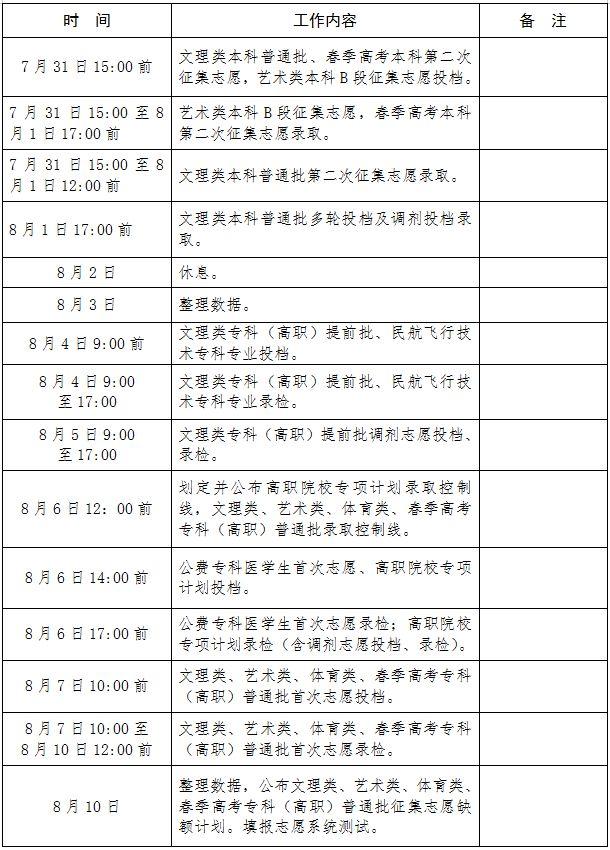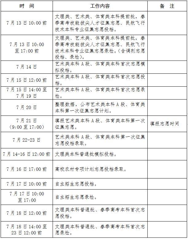 《通知》中显示,录取工作分5个批次进行,依次为本科提前批、自主招生批、本科普通批、专科(高职)提前批、专科(高职)普通批。自7月2日开始,至8月14日结束。