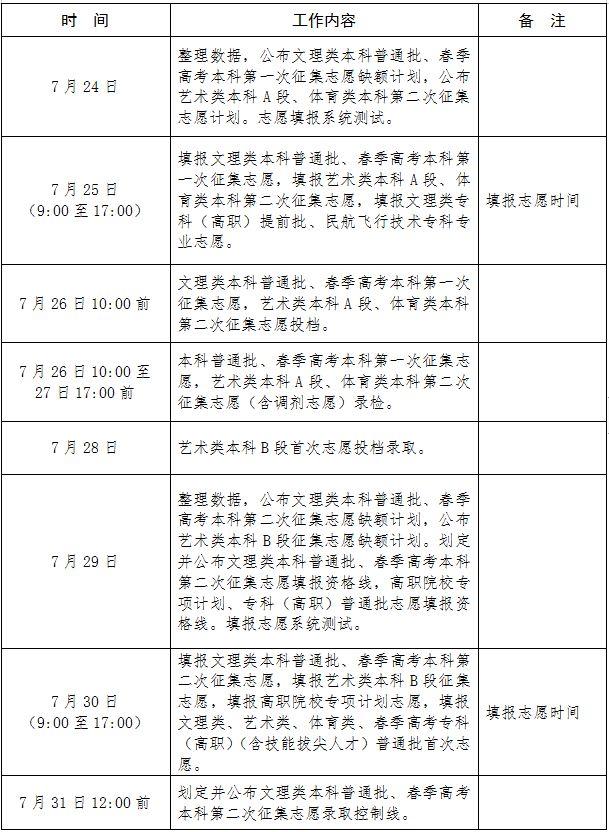 录取工作分5个批次进行,依次为本科提前批、自主招生批、本科普通批、专科(高职)提前批、专科(高职)普通批。自7月2日开始,至8月14日结束。