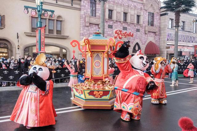 作为北京环球度假区的首个新春特别活动,“环球龙虎新年秀”提前带游客进入了春节的喜庆气氛。新年秀不仅有舞狮表演,功夫熊猫阿宝也化身“财神”,在表演队伍中向游客拜年。