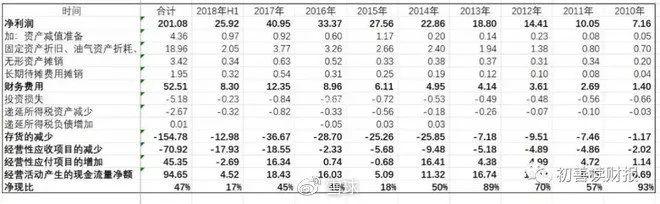 回头来看康美药业的净现比,从2010年至2018年上半年,康美药业累计实现净利润201.08亿元,经营活动现金流量净额只有94.65亿元,净现比只有47%,即实现1元的净利润流入的现金只有0.47元。尤其是2018年上半年,净现比只有17%。