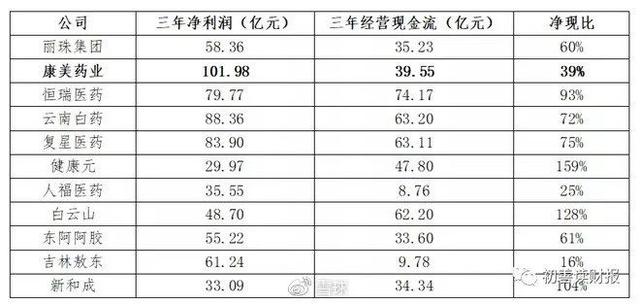 跟主要医药公司相比,康美药业的净现比是最低的。