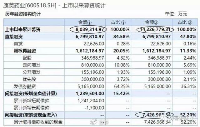 那么这么多年的存贷双高是怎么来的呢?股债双融资。看康美药业上市以来的募资统计,其中首发融资只有2.26亿元,但是配股、增发、优先股分别融资34.70亿、96.52亿、30亿,股权累计融资163.48亿元,债务融资更厉害,累计借款融资123.95亿元,债券融资516.5亿元,股债合计融资803.93亿元。如果借款融资按照筹资现金流入的话,则高达742.7亿元,股债合计融资1422.68亿元。