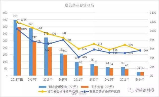 看康美药业的报表,截止2018年半年报,公司货币资金余额为399亿元,同时有息负债(包括短期借款、长期借款、应付债券、其他负债等)高达347亿元,占净资产的比例分别为119%和104%。而且拉长周期看,康美药业的存贷双高并非一日形成的,从2010年开始,其货币资金和有息负债余额分别为28亿、28亿,占净资产的比例均为56%,占比一路上涨,尤其是近四年,一步一个台阶,公司的资产负债表上除了现金就是有息负债,像一对孪生兄弟,很有意思。