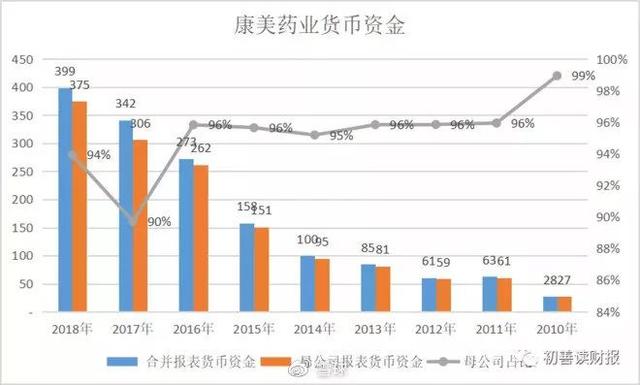 截止2018年半年度,康美药业并表子公司高达120多家,是不是因为子公司多导致存贷双高呢。从2010年开始,康美药业已经存贷双高了,但是当年康美药业并表子公司只有12家,因此康美药业的存在双高也不是因为子公司众多导致的,其货币资金主要存放在母公司。对比康美药业的母公司报表货币资金及合并报表货币资金可以发现,康美药业的母公司货币资金占比非常高,一直在90%以上,
