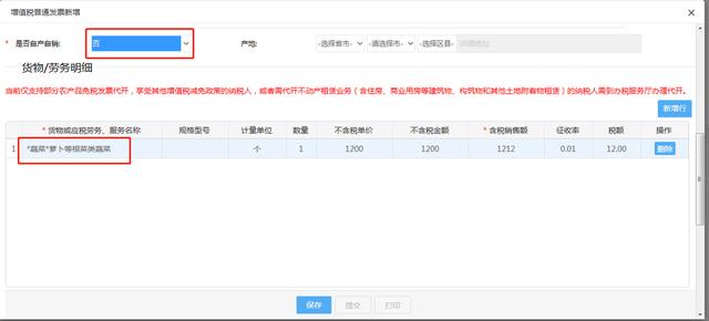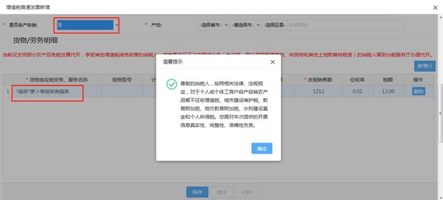 自然人代开普票时,商品名称勾选了蔬菜类免税商品的,页面自动带出自产自销选项,选择是,税额全免;