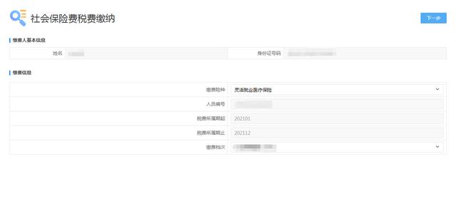 进入后,系统自动带出税款所属期和缴费档次,有多个缴费档次纳税人可自行选择缴费档次。点击“下一步”按键进入缴费界面。