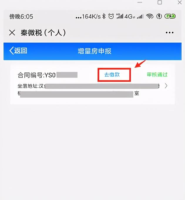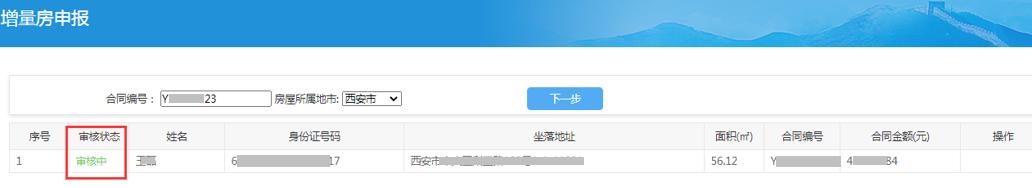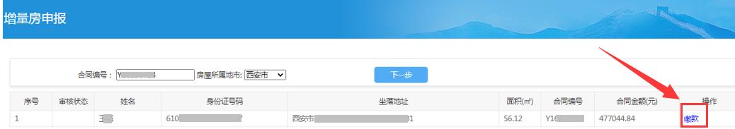 收到受理通过的短信后,纳税人二次进入增量房申报引导页,输入合同编号和选择地市,点击“下一步”按键,系统弹出复核通过的增量房申报数据,点击操作列“缴款”,进入缴款界面。