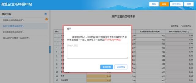 三、企业提交所得税清算申报表时,若表单有提示性校验纳税人确实有特殊情况发生需要继续申报,系统会弹框提示企业填写原因:“尊敬的纳税人,您填写的部分数据项与本年属期财务报表年报数据不一致,请填写不一致原因。”(输入框原因不能少于20个字节)。