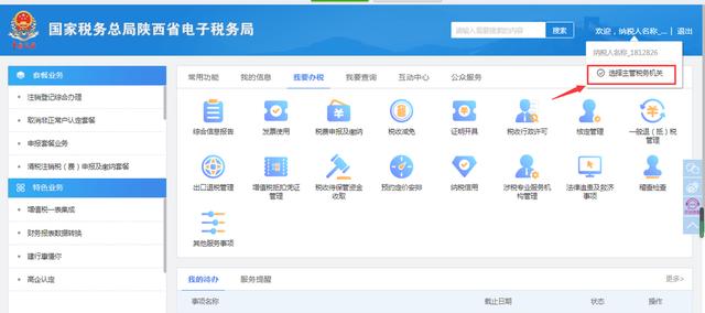 纳税人登录电子税务局后,鼠标移至主界面纳税人名称处,然后选择报验户纳税人经营地主管税务机关,如下图: