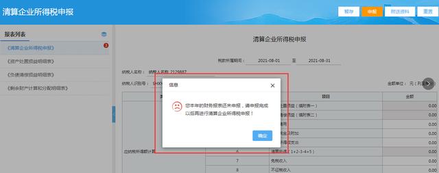 二、企业清算所得税申报前会监控当期财务报表年报(当前时间年度税款所属期)是否申报,若没有申报会提示:您本年的财务报表还未申报,请申报完成以后再进行清算企业所得税申报!