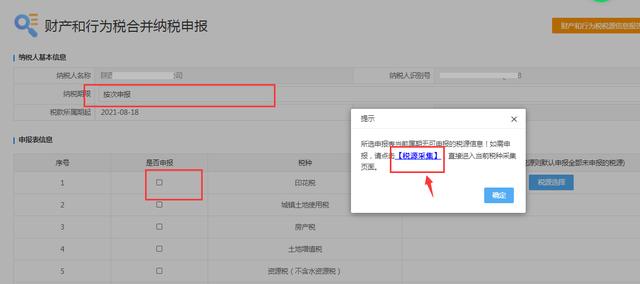 点击【新增税源】,进入印花税税源采集页面,如果该所属期已采集信息,则提示“您的[税款所属期起][税款所属期止]有已采集过的税源信息,请在原税源采集信息做修改”;无采集则没有提示。