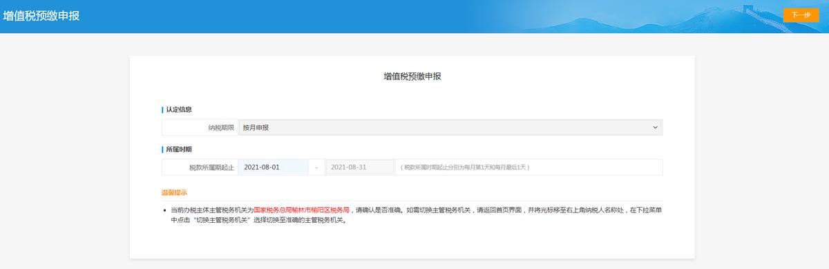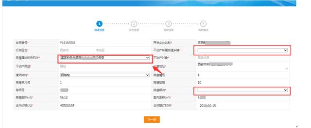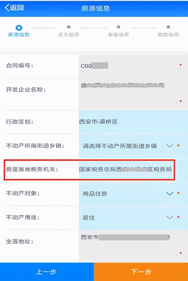 在房源信息界面,确认带出数据是否正确,并填写其他必填项信息,点击“下一步”按键前,必须确认“房屋所属地税务机关”(申报会提交到此税务机关复核),确认无误后进行下一步操作。