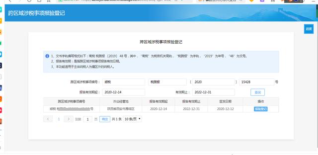 按照页面提示要求,将文书字轨填入跨区域事项编号中,同时选择报告有效期起止时间,点击查询按键,如下图: