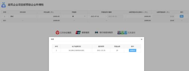 页面填写“项目名称”、“项目金额”、“当期预缴实际经营收入”等数据后,直接进行缴款。如下图: