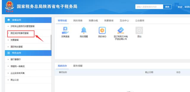 切换后,在左侧“套餐业务”模块中点击“跨区域涉税事项套餐”,进入
