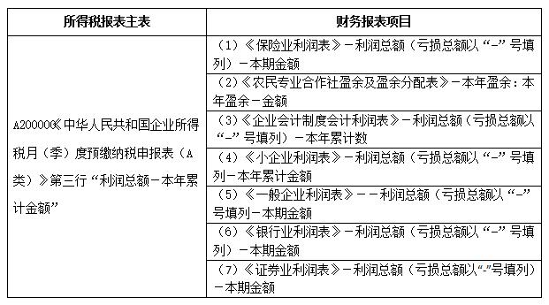 企业所得税申报时,增加“企业所得税月(季)度预缴纳税申报表(A类)中的利润总额数据”和“企业财务报表对应项目”的比对校验,主要项目如下: