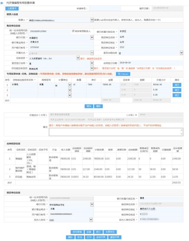 代开增值税专用发票申请单中“是否签订合同”选择“是”,填写合同签订日期,选择印花税征收品目后,应纳税款信息栏中自动计算印花税税款。