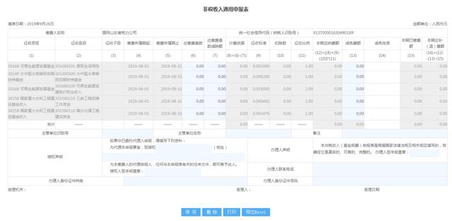 根据《关于调整部分政府性基金有关政策的通知》(财税〔2019〕46号)要求,调整《非税收入通用申报表》有关设置。当“征收项目”为“国家重大水利工程建设基金”时,“征收标准”栏按照财综〔2009〕90号文件规定的征收标准设置(最多为小数点后两位),“本期应纳费额”栏计算公式调整为: