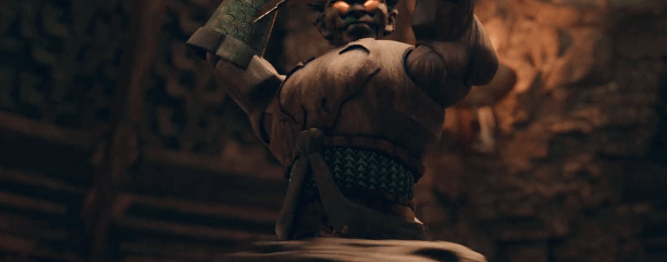 木偶从天而降,下半身如陀螺般飞速旋转,上半身或四臂飞刀,或恃戟行凶。