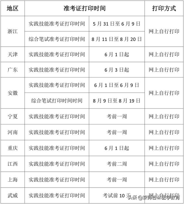 各地区2021年医师资格考试准考证打印时间: