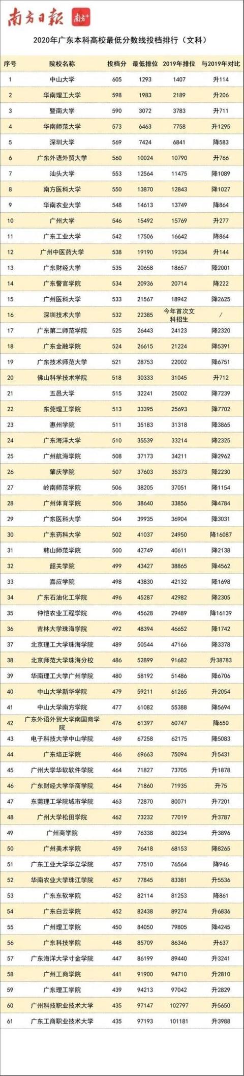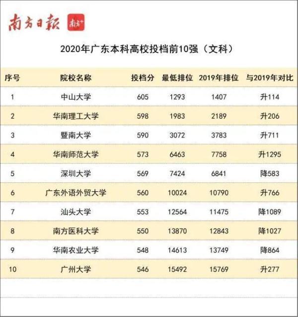 2020年文科六至十名高校与2019年相比没有变化,分别是广东外语外贸大学、汕头大学、南方医科大学、华南农业大学、广州大学。