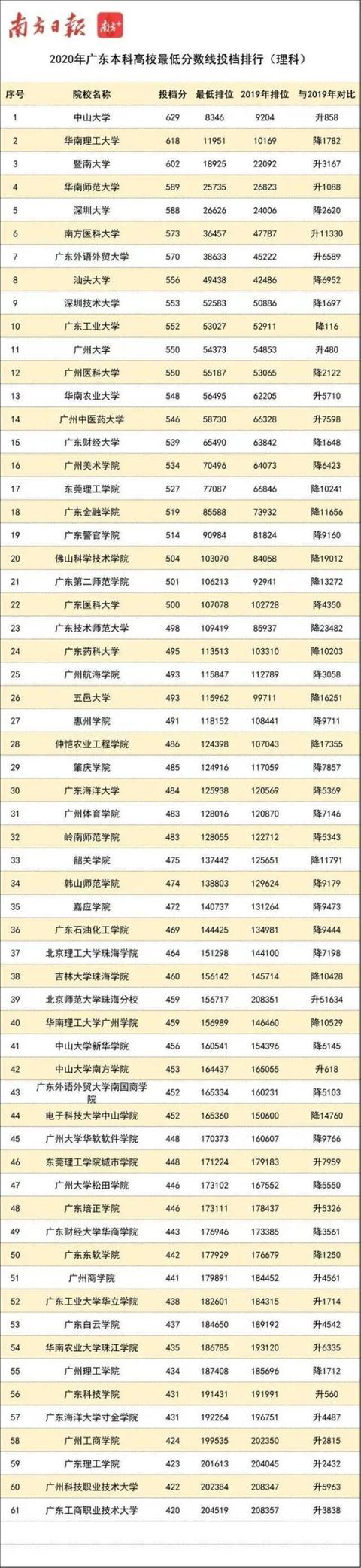 一批民办院校也颇受欢迎,比如广东科技学院文科最低分为448分、最低排位85709位,超本科线18分,理科最低分为431分、最低排位191431位,超本科线21分;去年转为职业大学的广州科技职业技术大学、广东工商职业技术大学,最低排位比去年上升5963、3838位。