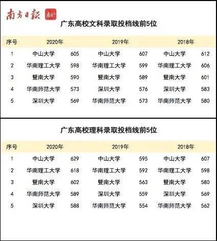 过去3年,上述5所大学稳居省内投档线前五名。但2020年华师的投档线排名前移,文理科都位居第四名,但后起之秀深大与华师的投档线十分接近,文理科分差仅为4分和1分。其他4所高校的较量,也颇为激烈。