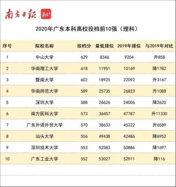 全省理科十强排名变化较大,南方医科大学从第八名上升到第六名,广东外语外贸大学、汕头大学、深圳技术大学、广东工业大学位居第七至第十名。其中2020年有两所高校进步较快,最低排位提升迅速,分别是南方医科大学最低排位为36457位,比2019年上升11330位;广东外语外贸大学,最低排位为38633位,比2019年提升6589位。