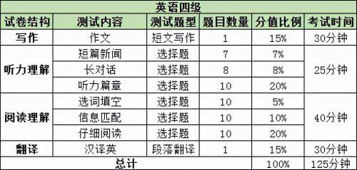 英语四级考试题型及分值比例等