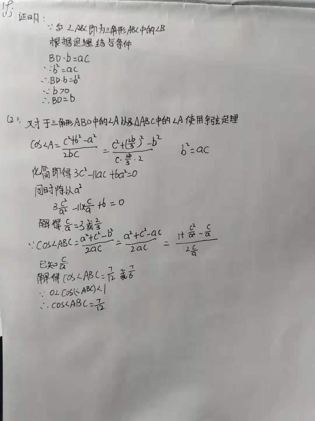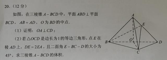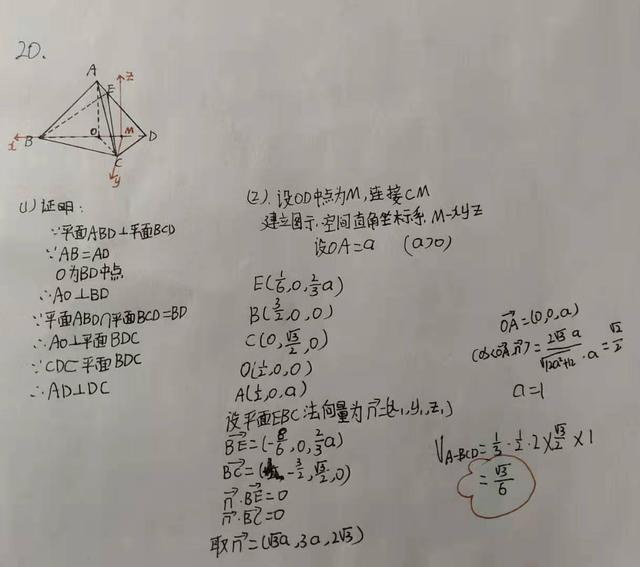 20题往往是几何题目,套路常为第一问证明一个较为简单的垂直(多数立体几何的证明题常会做辅助线,所以找准辅助线很重要,但在这次只在第二问有考察较容易的辅助线),第二问往往与建系求法向量有关,从而求正余弦。掌握面与面的夹角,线与线,线与面的夹角公式即可。