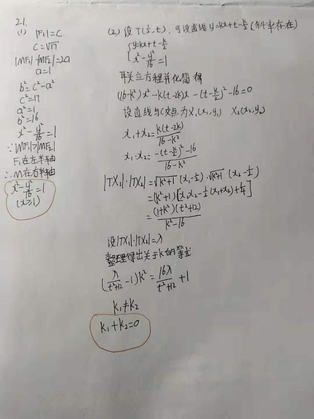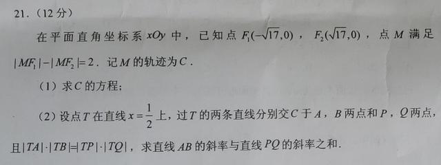 21题难度是中等偏上的题目,第一问较简单,了解高中3个常见特殊曲线(抛物线,双曲线,椭圆)定义即可知道。第二问往往是联立方程求解,思维难度不是很大,顺着题目所给条件,然后把由条件一一得出的结论列出即可,剩下的考察的更多是学生的计算能力与对方程式化简的能力