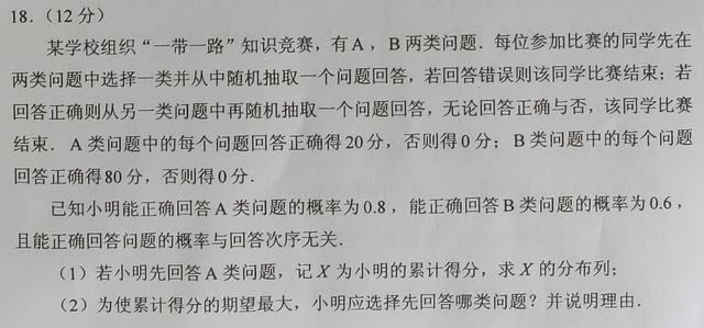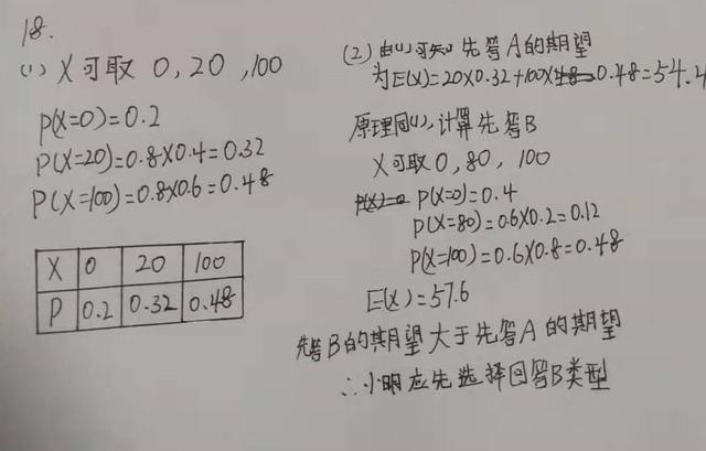 18题同样为简单题型,多为概率题型,这道题或许只看题目有些迷茫,可以尝试在草稿纸上把类别分出来以及把概率标记到所分类上。掌握超几何分布、二项分布、正态分布,并多加提高自己的计算能力,这种题型无论怎么变化,我们都能轻松将其“制服”。