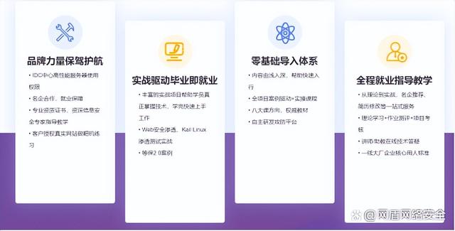 目前市面上的培训机构都做的很杂,不仅做it还做所谓的媒体培训等等,似乎只要能盈利的都要去分一杯羹,在招生时忽悠学生说有配套的专业课程,去了才知道其实是it培训的一个分支。而网盾安全学院在教学上体现精而专,完完全全专注于网络安全,无论是在业务版块,还是导师的专业性上都可窥探一二。