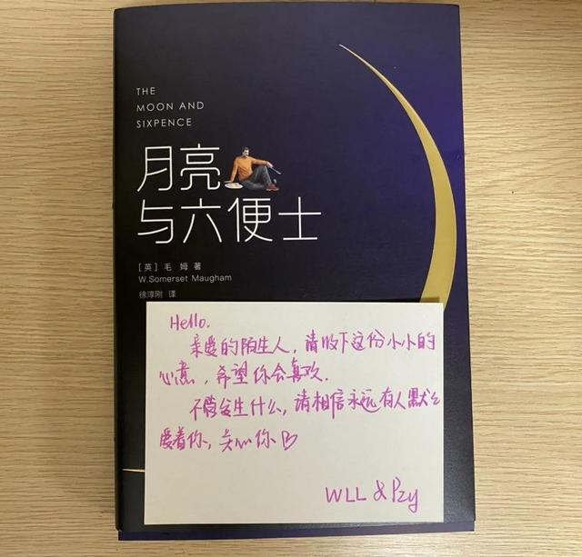 家门口的公交站,今天也显得特别的漂亮亲切,天边姐谨慎的环顾着四周,看看周边有没有人,千万不要让自己窃窃自喜的囧况让别人给发现了!这么一把年纪了!“跟神经病一样”多不好意思!…还好没人,这时她发现公交车站的椅子上有一本厚厚的还未坼封的书籍,诶;是谁粗心嗯下的,她小心拿起看看,是一本当今非常畅销的,十九世纪初英国作家毛姆写的《月亮与六便士》,书下还附带着一张卡片,上面写着;“哈罗;亲爱的陌生人,请收下这份小小的心意,希望你会喜欢。不管发生什么,请相信永远有人默默爱着你,关心你❤️”下面落款是WLL&Pzy。