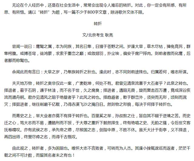 2003年北京高考作文题,北京考生耿亮写的《转折》