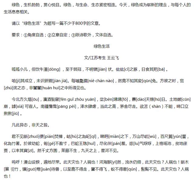 2010年江苏高考作文题,江苏考生王云飞写的《绿色生活》