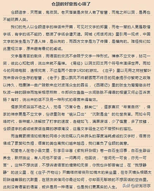 第1篇《仓颉的好意我心领了》,这篇作文的标题带着浓重的“网络语言”。而篇中文字也极尽诙谐幽默,充分体现出这名考生对生活的观察入微和文字的驾驭自如,而且通篇可以说是字字珠玑,文字内容充实有趣,让人叹为观止。最经典的一句是:儒家厌烦滔滔不绝之人,觉得“巧言令色,鲜矣仁”,道家喜欢“希言自然”,佛家的禅宗更是不立文字,俗谚里则有“祸从口出”“沉默是金”的处事良言。