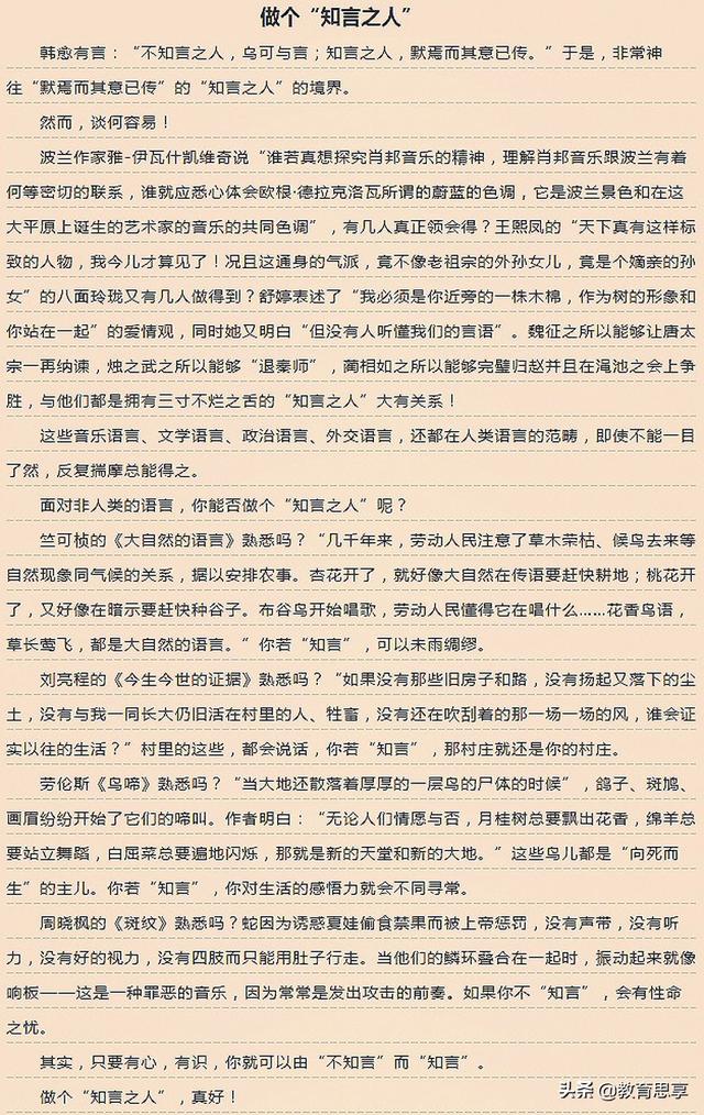 第2篇是《做个“知言之人”》,文章里也是引经据典,文辞优美,而且立意深刻。篇首写道:“韩愈有言:‘不知言之人,乌可与言;知言之人,默焉而其意已传。’”可谓点睛之笔。而这位考生在文末又提道:“其实,只要有心,有识,你就可以由‘不知言’而‘知言’。”至此,全文首尾呼应,一气呵成。