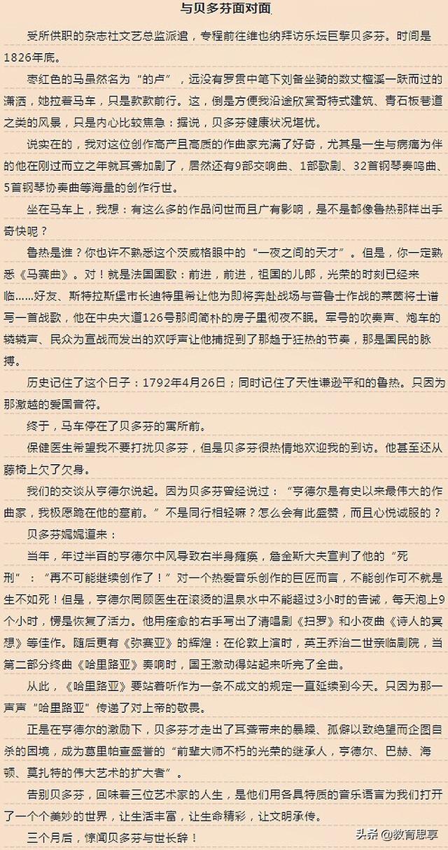 而第3篇《与贝多芬面对面》,这位考生则以丰富的想象力,给我们描绘出一则“穿越”故事:1826年底,我受杂志社文艺总监派遣去维也纳拜访贝多芬;在路上“我”回忆起鲁热,而和贝多芬交谈时“我们”又提起亨德尔;至此将3名伟大的音乐家巧妙地联系在一起;并且在文末点题:“告别贝多芬,回味着三位艺术家的人生,是他们用各具特质的音乐语言为我们打开了一个个美妙的世界,让生活丰富,让生命精彩,让文明传承。”