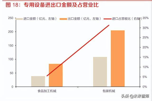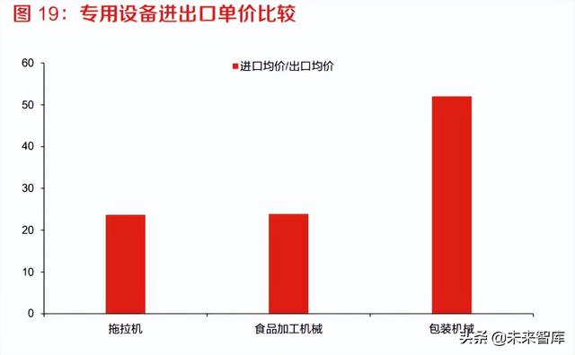 专用设备一般用于采矿、冶金、化工、食品等行业,2020 年我国专用机械行业全年实现营业收入 32726 亿元。专用设备进口额度最大的是特种工业专用机械,进口额达到 3393.94 亿元,占据专 用设备进口额 90%以上金额;出口额达到 3529.85 亿元,略低于进口额。其他细分行业中,包装 机械 2020 年进口额 108.41 亿元,出口额 204.99 亿元;食品加工机械进口额 38.77 亿元,出口额 83.32 亿;拖拉机进口额 3.32 亿,出口额 33.00 亿元;纺织机械、缝纫机械我国基本实现自主供 应,基本不存在进口,2020 年出口金额分别达到 317 亿元和 120 亿元。专用设备中拖拉机、食品 加工机械、包装机械进口单价均远高于出口单价,分别达到 23 倍、23 倍、52 倍,可能与进出口 机械设备的吨位和档次有关。(报告来源:未来智库)