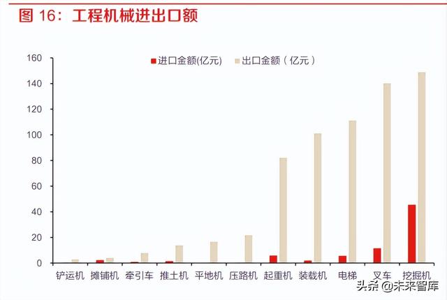 工程机械出口金额大,主要机型对外依赖度较低:工程机械领域,我国是出口大国,出口金额约 为进口金额的 5 倍,但出口单价大多低于进口单价。其中,挖掘机、平地机、压路机、装载机进 出口单价相差较小,电梯、叉车、推土机、摊铺机、铲运机和起重机进出口单价差距较大,起重 机进口单价接近出口单价的 12 倍,铲运机进口单价接近出口单价的 6 倍,摊铺机和推土机进口单 价接近出口单价的 4 倍。我们认为工程机械的挖掘机/装载机等主要机型的进出口价差不大,反映 国内品牌的竞争力较强,部分机型的进口价格与出口价格差距较大可能与吨位等结构性因素有关。